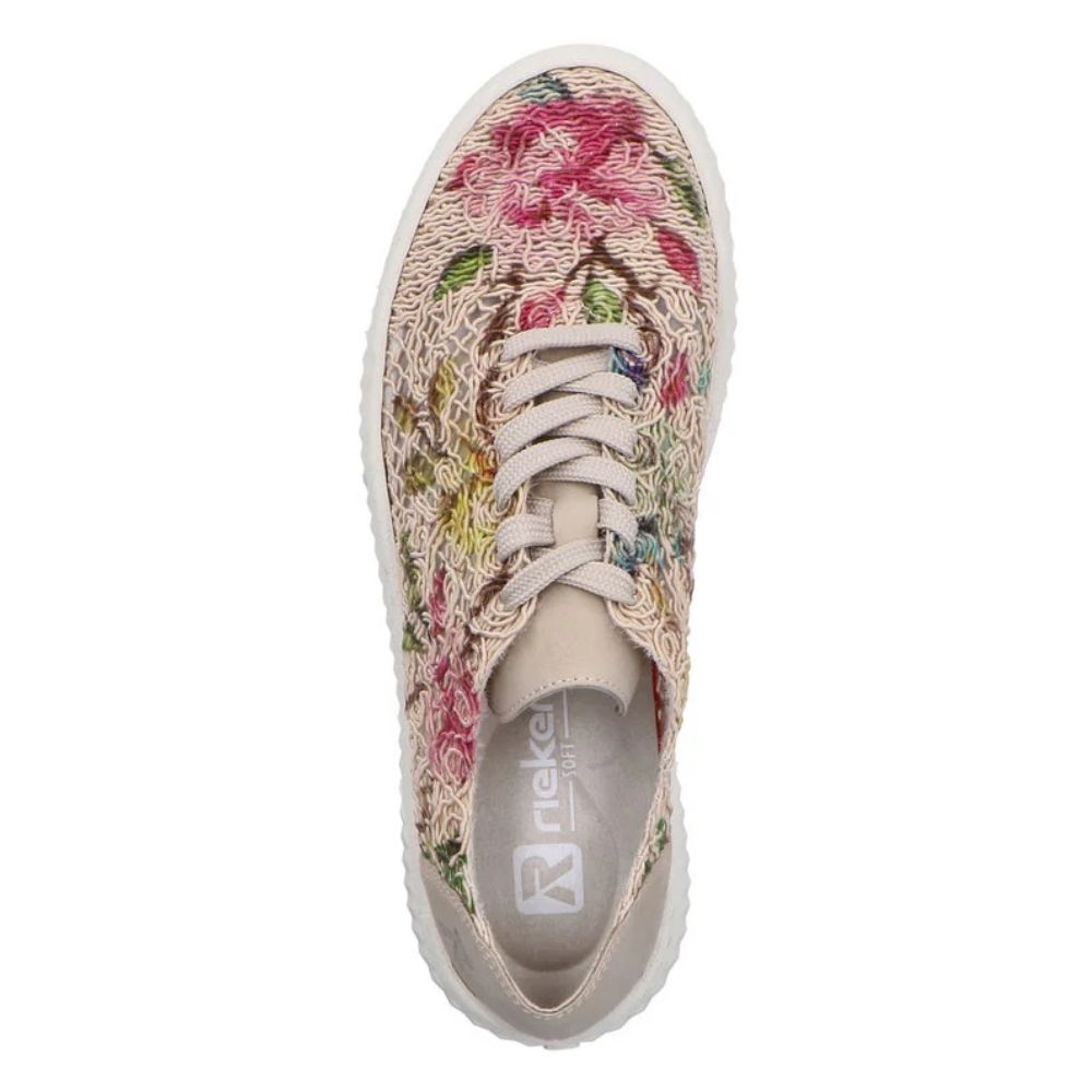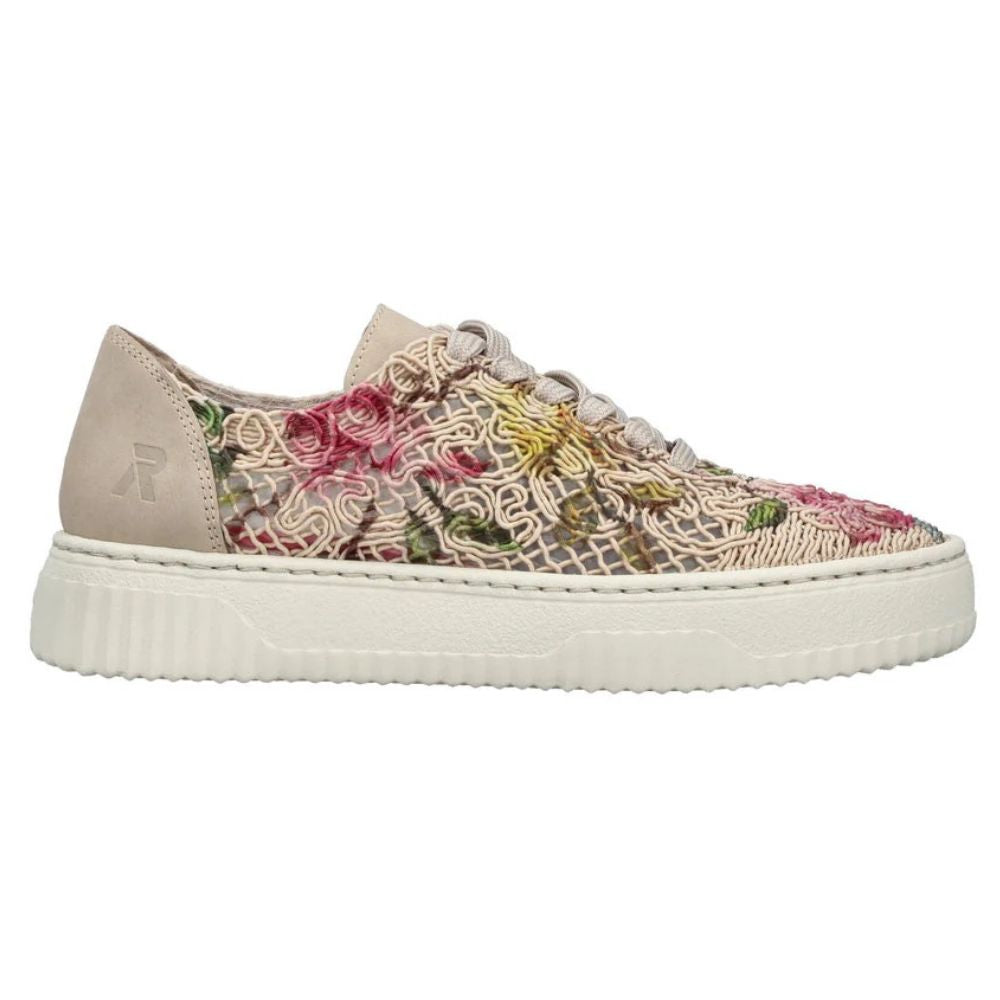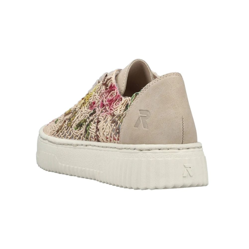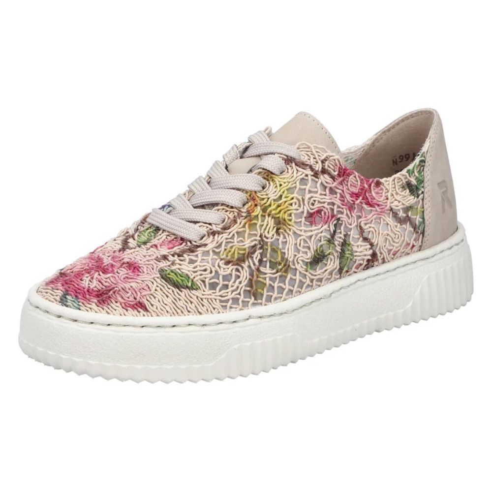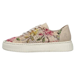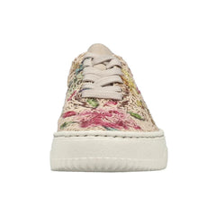 Embrace ethical style with the Rieker Enya 19 sneaker. These animal-free low-tops feature a striking multi-coloured floral design that brings personality to your everyday rotation. Crafted with traditional stitchdown construction, they deliver exceptional durability and flexibility. Precision lacing provides a secure, customized fit, while the shock-absorbing platform sole and soft removable insole keep your feet cushioned all day long. Where conscious fashion meets reliable comfort.
