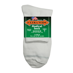 Don't let Edema or swollen feet hold you back! Say goodbye to tight medical socks and hello to these Extra Wide Medical Quarter White Socks! Made with soft ring spun cotton, they stretch wide in the foot and ankle while still keeping their shape. Infused with Microban to fight stinky bacteria, and an inverted toe seam for a seamless feel. Choose between white or black and 3 sizes for a perfect fit from men's size 16 to women's size 7, up to a 6E width. Plus, they're made in the USA!
