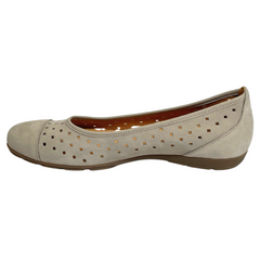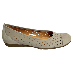 Step into spring with effortless elegance in these stylish perforated flats. Crafted from soft, taupe-toned suede, these shoes feature a breathable design with delicate square cutouts—perfect for warmer days. The rounded toe and low-profile sole offer a classic silhouette, while the cushioned insole ensures all-day comfort.