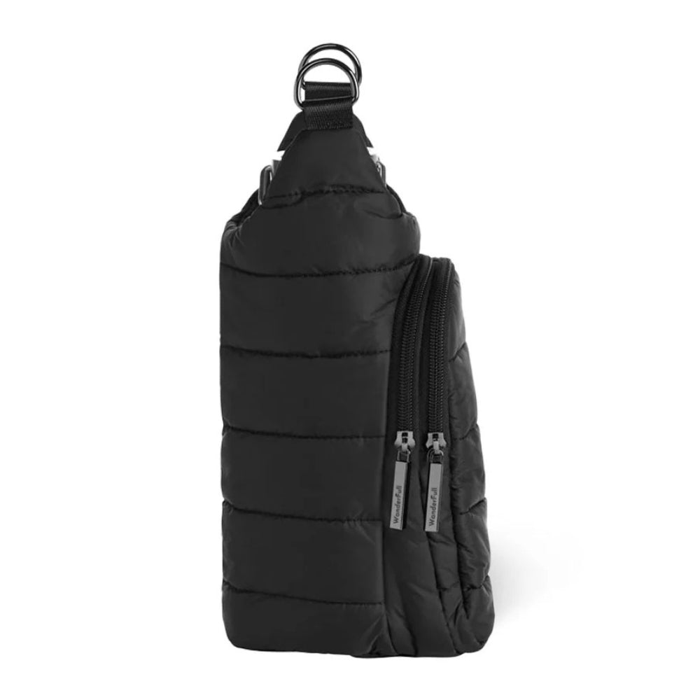 Stay hydrated and hands-free on the go with the patented WanderFull® HydroBag®, perfect for travel, festivals, walks, and more. Keep your reusable bottle safe and scratch-free while reducing single-use plastic waste. With two zippered pockets for your phone, passport, cards, and other essentials, it’s more practical than most small bags. The water-resistant design fits bottles up to 3.5" wide and protects your items from spills—also great for coffee cups or wine bottles. Lightweight, durable, and stylish with a quilted finish and adjustable strap, it’s a chic and functional accessory that makes a perfect gift.