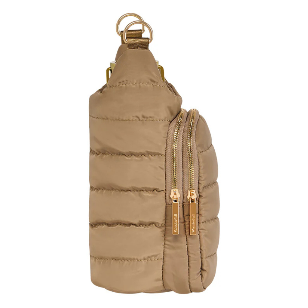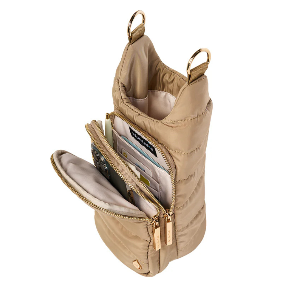 Stay hydrated and hands-free on the go with the patented WanderFull® HydroBag®, perfect for travel, festivals, walks, and more. Keep your reusable bottle safe and scratch-free while reducing single-use plastic waste. With two zippered pockets for your phone, passport, cards, and other essentials, it’s more practical than most small bags. The water-resistant design fits bottles up to 3.5" wide and protects your items from spills—also great for coffee cups or wine bottles. Lightweight, durable, and stylish with a quilted finish and adjustable strap, it’s a chic and functional accessory that makes a perfect gift.